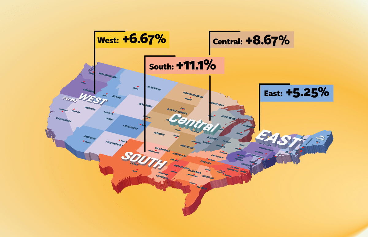For the third consecutive year, the Southern Region of the United States is projected to see the most growth in the country. Last year, the South paced the other regions by nearly 5%, projecting 13.5% growth. This year didn’t quite reach those heights, but it still sees a cumulative projection of double-digit growth (11.1%), more than 2% higher than the next closest region.